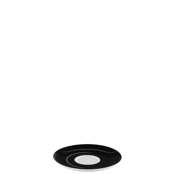 Tazzina da caffè in porcellana bianca con decoro nero, piattino nero con decoro bianco.
